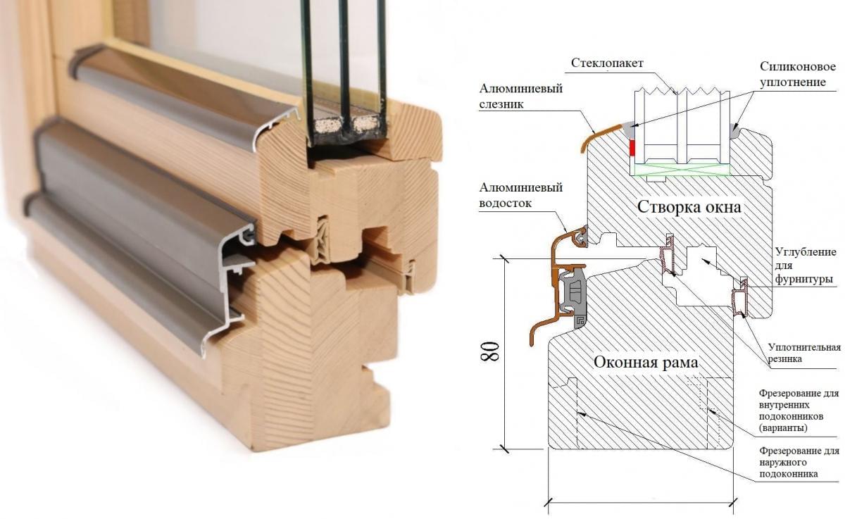 Рама и створка деревянного кона изготовлены из клееных деревянных брусьев, состоящих из нескольких склеенных в толщину слоев (ламелей). Средние ламели в брусе обычно наращены в длину, наружные могут быть как наращенными (так называемые «штукованные», или оптимированные брусья), так и цельные – ненаращенные (фиксированные брусья). Чаще всего окна изготавливаются из сосновых или дубовых брусьев, но доступен и материал других видов дерева, например, лиственница, меранти, сипо и др.